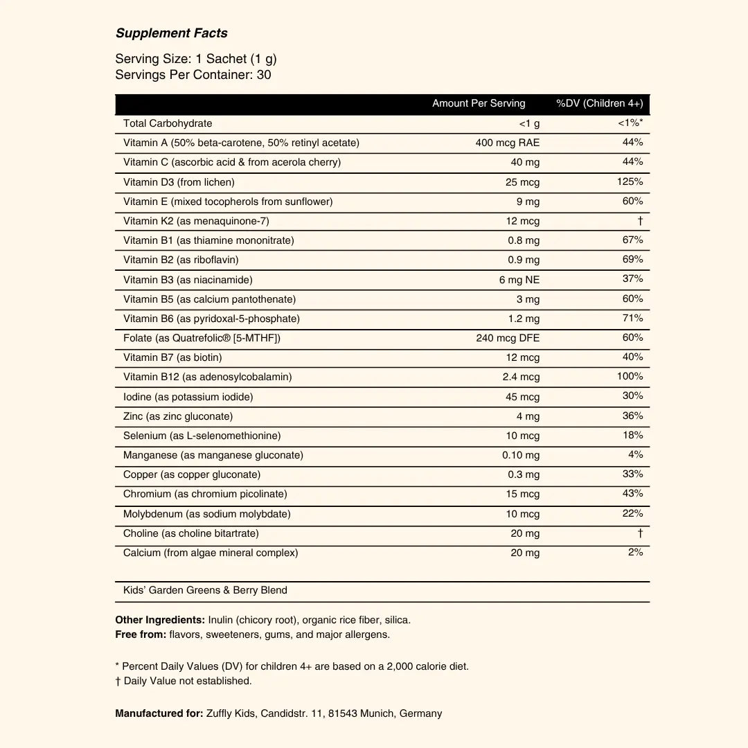 Most kids’ vitamins and vitamin gummies are filled with sugar, artificial flavors and dyes that don’t belong in a healthy routine. Zuffly Kids Daily Multivitamin contains no junk — only science-backed nutrients that support a healthy development. Because we care.
